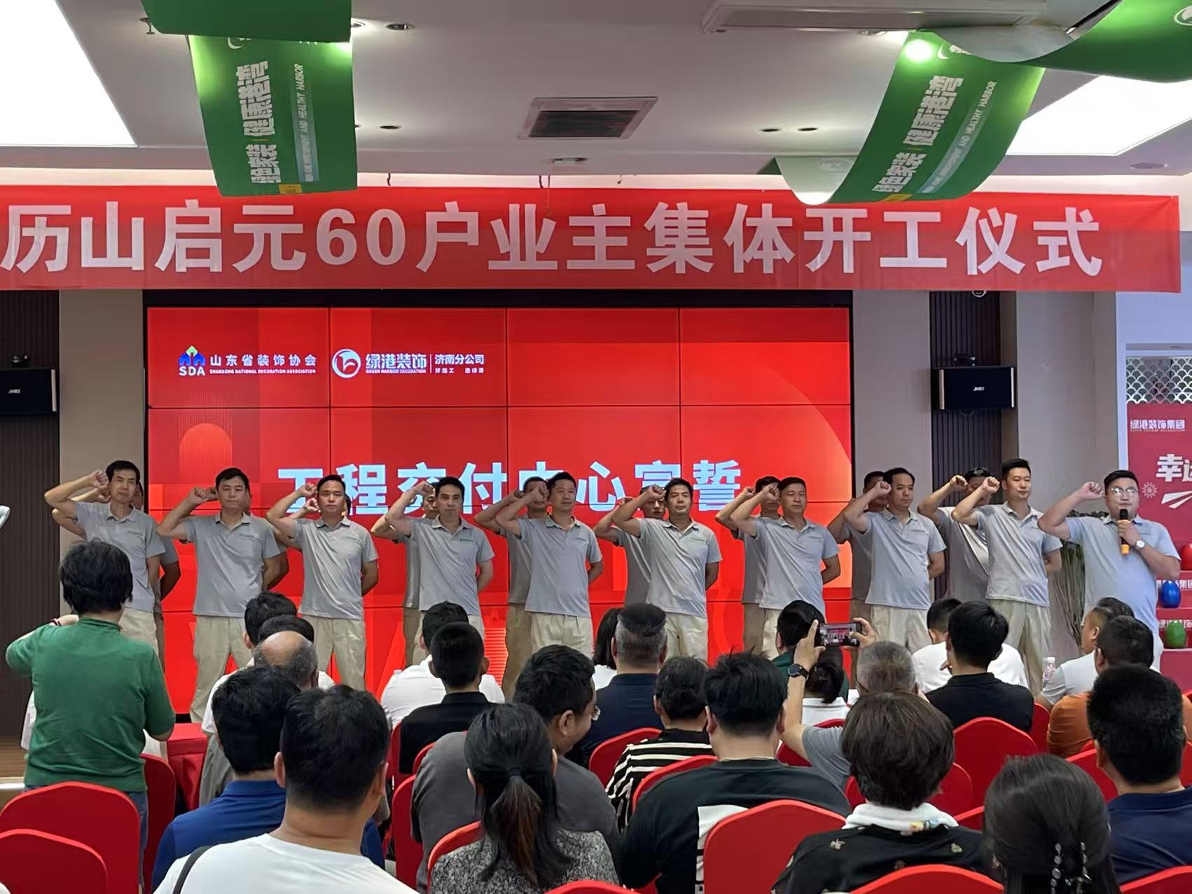 绿港装饰工程交付中心的全体员工整齐列队,庄严宣誓。他们承诺将以高度的责任心和专业精神,严格把控工程质量牛来乐,确保每个家装项目都能够按时、按质、按量交付给客户。誓言铿锵有力,表达了绿港工程团队对品质的执着追求和对客户的郑重承诺,赢得了现场阵阵掌声。