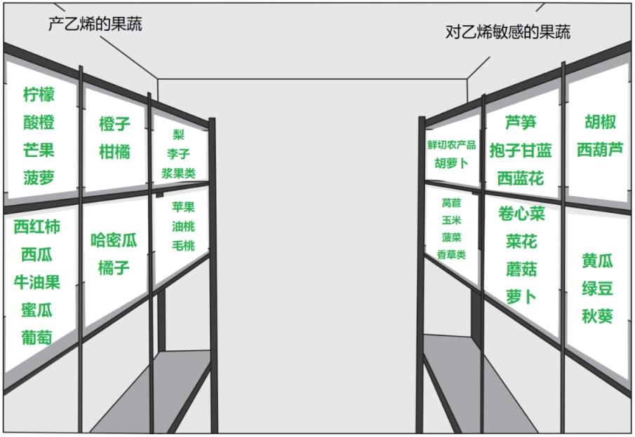 果蔬分类放置建议将产乙烯的果蔬和对乙烯敏感的果蔬分开放。此外,黄瓜、橙子、番茄等常见容易冷害的果蔬也都建议放冰箱。