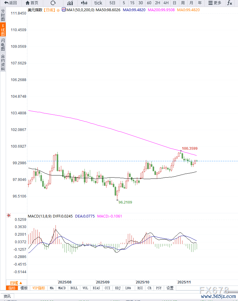从日线结构来看,DXY 在20日均线下方运行,短线趋势仍偏弱,但在99.50 区域存在强支撑。若指数能站稳该区间并重新上破 20 日均线(约 99.90),将打开向 100.50 的反弹空间。