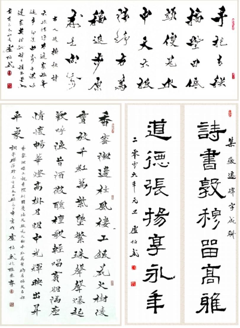 “练习书法就是练心,能让人气定神闲、心态平和。”卢绍武主席表示。 因为父亲写得一首好字,耳濡目染中,年幼的他也拿起毛笔写字,喜爱上了书法。还有他抗美援朝的志愿军烈士二哥留给他纪念的是颜真卿、柳公权、赵孟頫的三本字帖,更加是他数十年追蓦临习的挚爱。他对颜、柳、褚体等唐楷法书曾下过苦功夫,上溯金文秦篆、汉隶章草,下习宋元明诸家如米芾、文征明、董其昌等各大家书体,撷取各家之长而自成风格。
