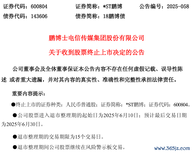 *ST鹏博(600804)公告称,公司于2025年5月30日收到上海证券交易所出具的自律监管决定书,决定终止公司股票上市。终止上市的证券种类为人民币普通股,证券简称为*ST鹏博,证券代码为600804。