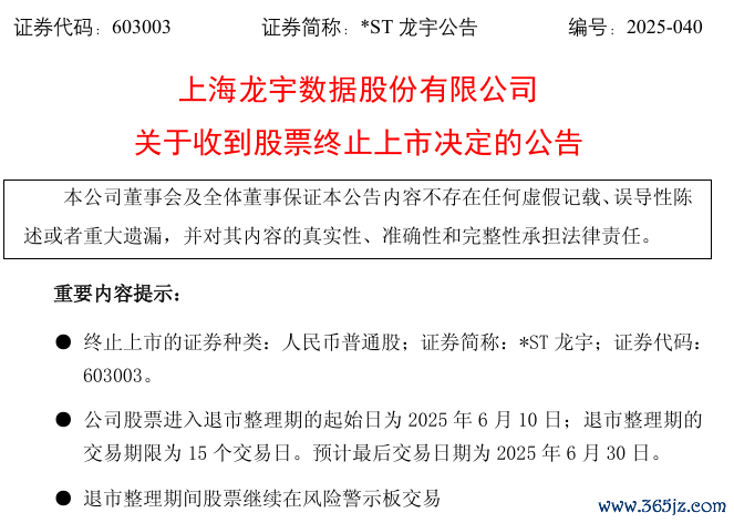 *ST龙宇(603003)也公告,公司于2025年5月30日收到上海证券交易所出具的自律监管决定书,决定终止公司股票上市。终止上市的证券种类为人民币普通股,证券简称为*ST龙宇,证券代码为603003。