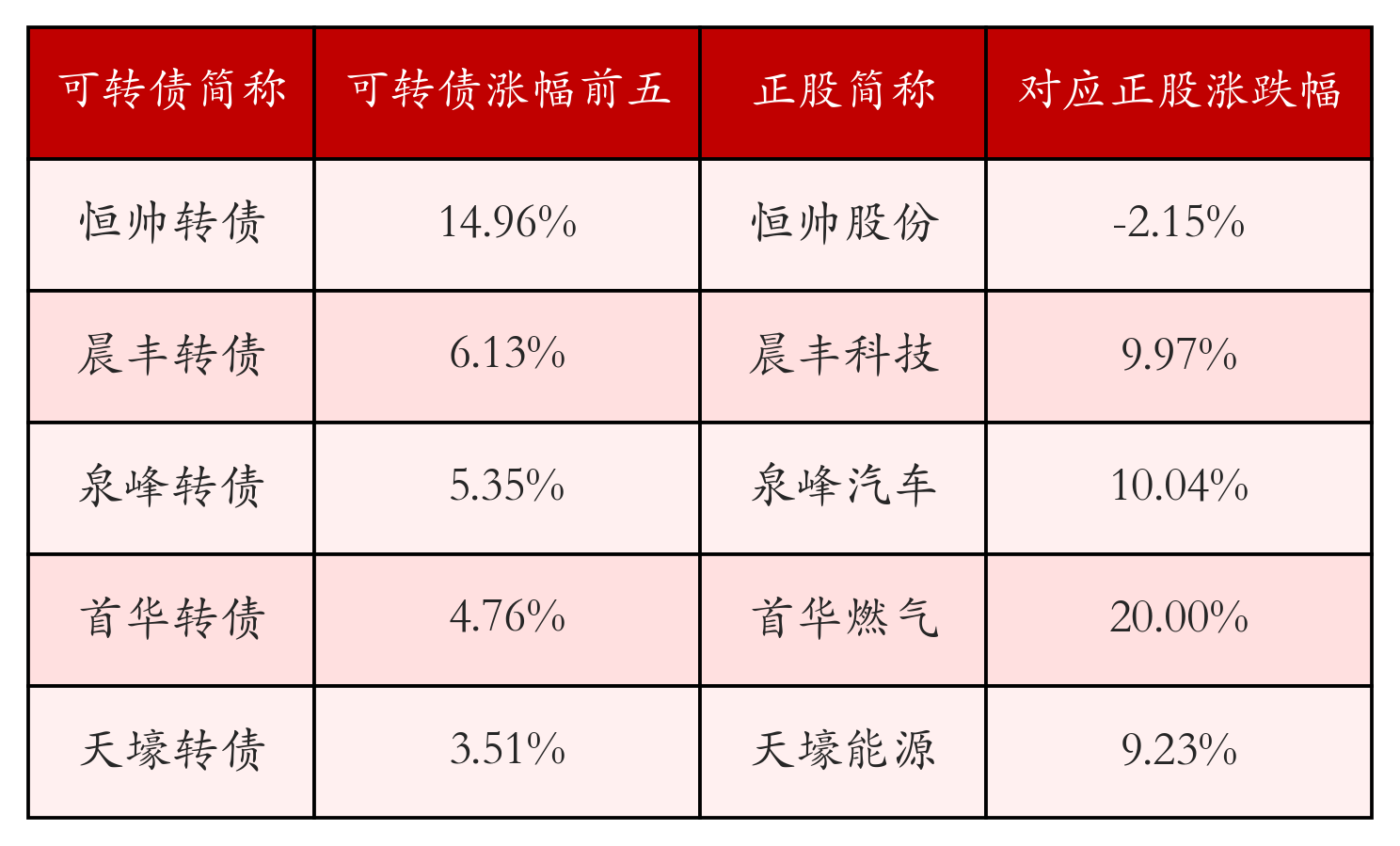 南财智讯6月19日电,南财金融终端盘后数据显示,债市方面,中证转债指数收跌0.49%,报433.14,成交额为571.27亿元。可转债方面,今日共成交469只可转债,其中62只收涨,0只收平,407只收跌。具体来看,5只可转债涨幅超过2%。其中恒帅转债(123256)涨14.96%,晨丰转债(113628)涨6.13%,泉峰转债(113629)涨5.35%。今日有30只可转债跌幅超2%,东时转债(113575)跌11.77%,利民转债(128144)跌10.75%,精装转债(127055)跌8.15%。存在交易量的可转债所对应的正股中,73只收涨,6只收平,390只收跌。具体来看,6只可转债对应正股涨幅超过5%,其中,首华燃气(300483)涨停,收涨20.0%;泉峰汽车(603982)涨停,收涨10.04%;晨丰科技(603685)涨停,收涨9.97%。同时所对应的可转债:首华转债(123128)同涨4.76%;泉峰转债(113629)同涨5.35%;晨丰转债(113628)同涨6.13%。今日有15只可转债对应正股跌幅超过5%,利民股份(002734)跌停,收跌10.0%;苏利股份(603585)跌停,收跌9.99%。同时所对应的可转债:利民转债(128144)同跌10.75%;苏利转债(113640)同跌2.69%。
